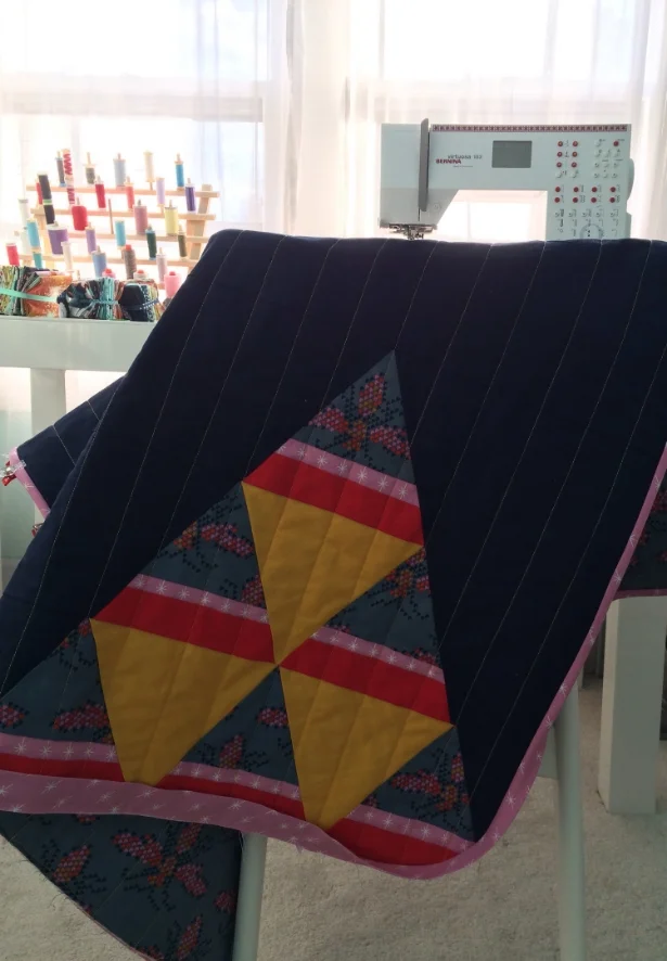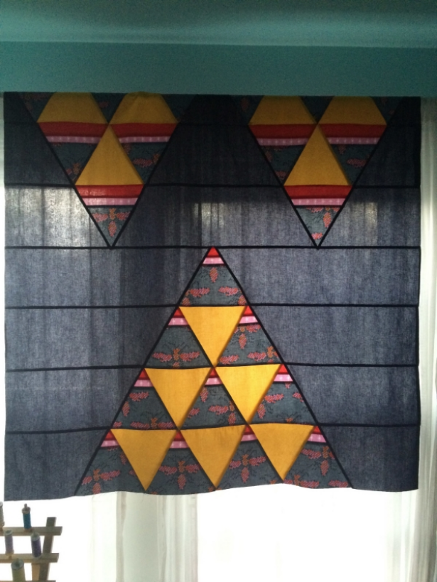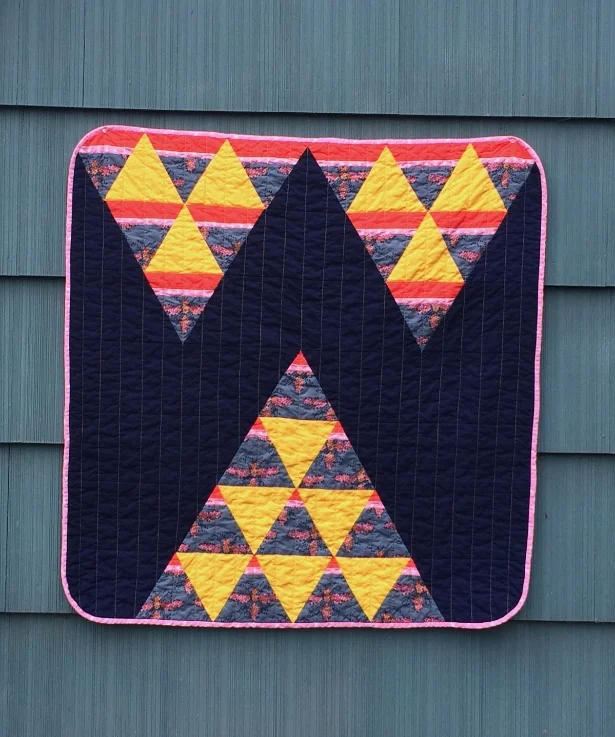 I had a lot of fun designing this quilt and putting it together. I knew I wanted to do triangles, and I got it in my head that I wanted to make at least some of the triangles striped. First, I sewed together a few strips of a Kona cotton red, and Cotton + Steel/Melody Miller’s stars in pink, and I Heart Bees in gray. I cut equilateral triangles with my ruler. I didn’t like the idea of wasting half of the triangles, so the triangles with the bees at the base became the bottom large triangle, and the triangles with the red at the base became the top two triangles. I cut yellow triangles to fill in the holes. I think the yellow is also a Kona cotton. It was leftover from another project that is still in the works. After trimming all of the triangles, I sewed them into horizontal strips. Then I broke out the navy, which is from American Made, and finished piecing the horizontal strips. Finally, I sewed all of those horizontal strips together, and voila – I had a finished quilt top.