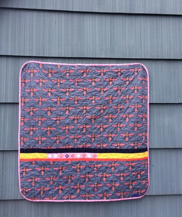After I finished my quilt top and backing I read some rumblings on the internet that there may have been some sort of production issue causing the bees fabric to run at a slant. That never occurred to me as I was working with the fabric. I just embraced the angle. The angle looks more like bees in flight to me!