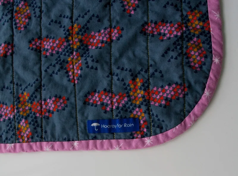 Finally, I quilted vertical yellow lines, which ended up looking like pinstripes to me. I rounded off the corners (can’t stop, won’t stop!) and bound it with the remaining pink stars fabric.